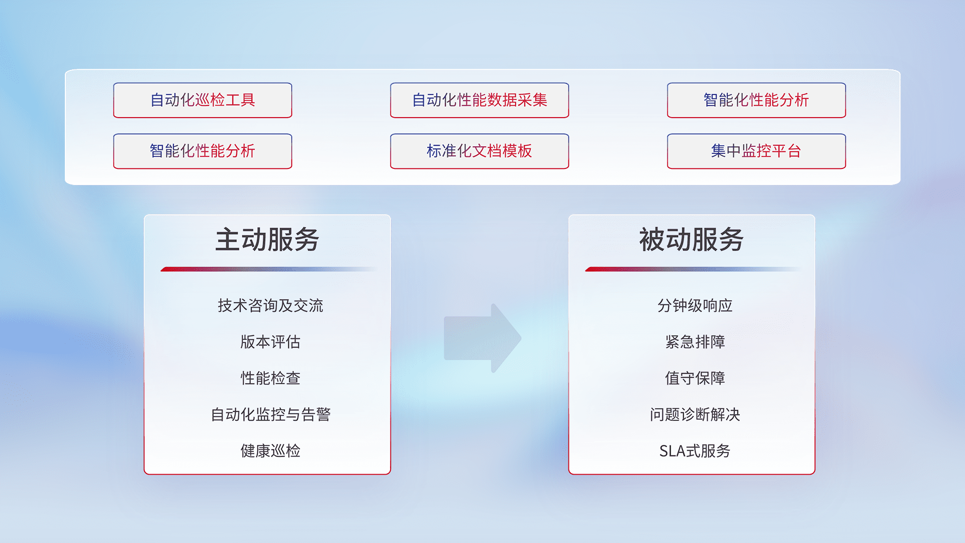 智能化工具和标准化文档,,,,保障服务质量,,,提供主动服务(包含技术咨询、、版本评估、、、、性能检查、、、自动化监控与告警、、、、健康巡检)和被动服务包含(分钟级响应、、、紧急排障、、、、值守保障、、、、问题诊断解决、、、SLA服务)。。。。