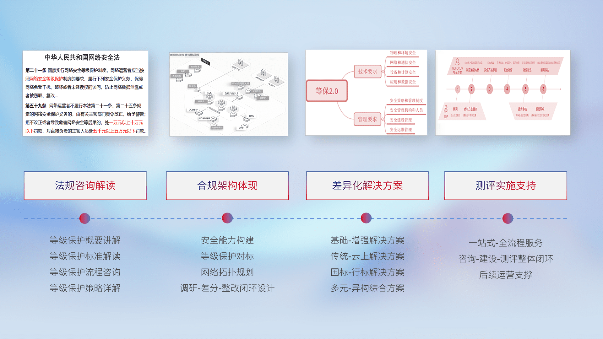 通过专业的法律咨询解读、、合规架构体现、、、差异化解决方案、、、测试实施支持等服务,,,为客户量身打造等保合规体系。。